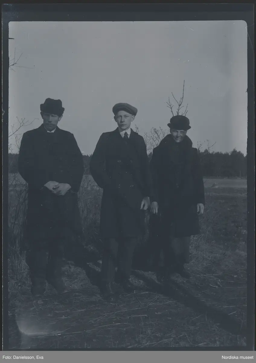 Porträtt av en man, ungdom/pojke och kvinna, utomhus. Möjligen en familj.
