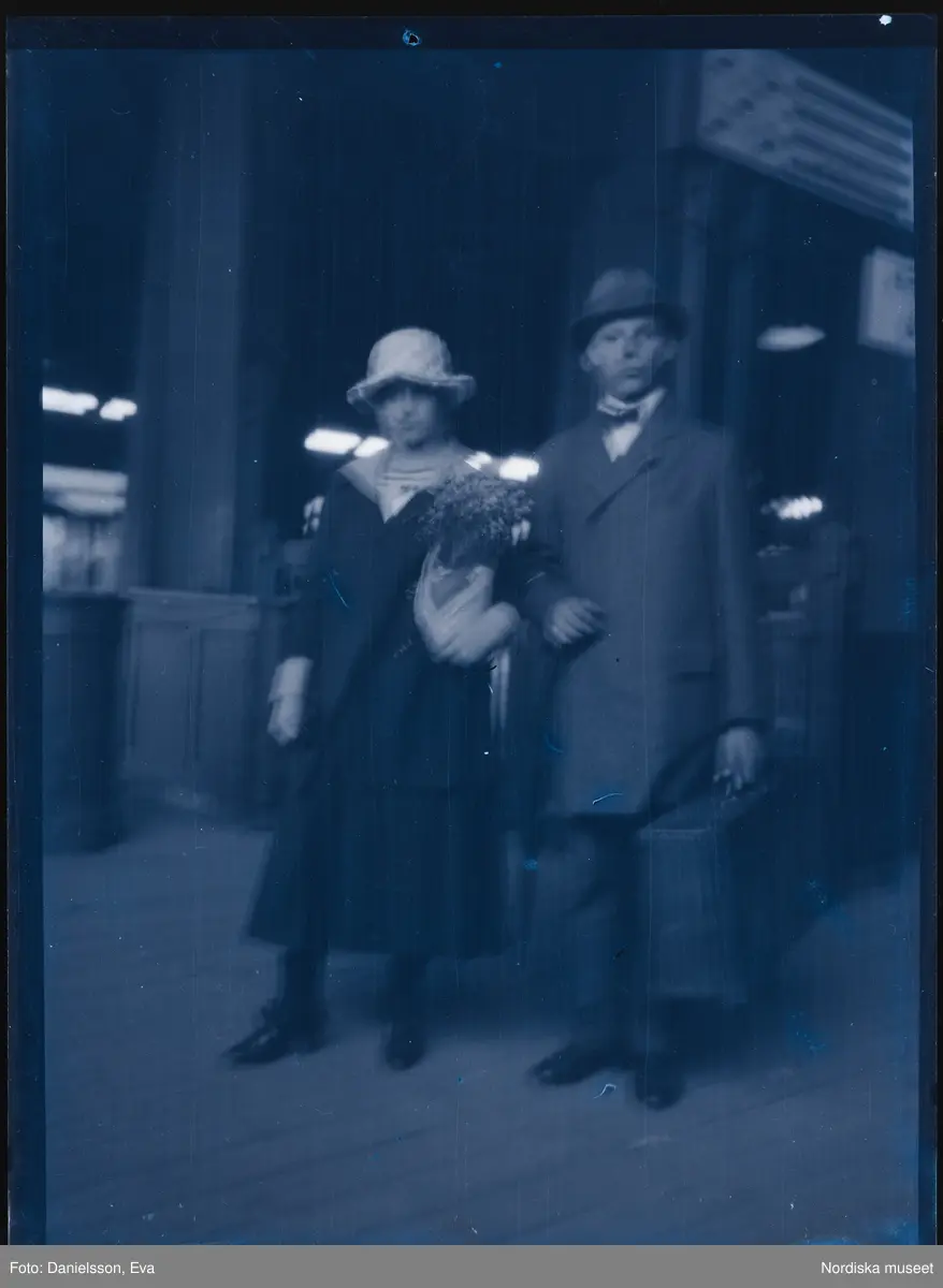 Porträtt av ett ungt par, möjligen på en tågstation. Kvinnan håller en bukett blommor i famnen, han bär en resväska.