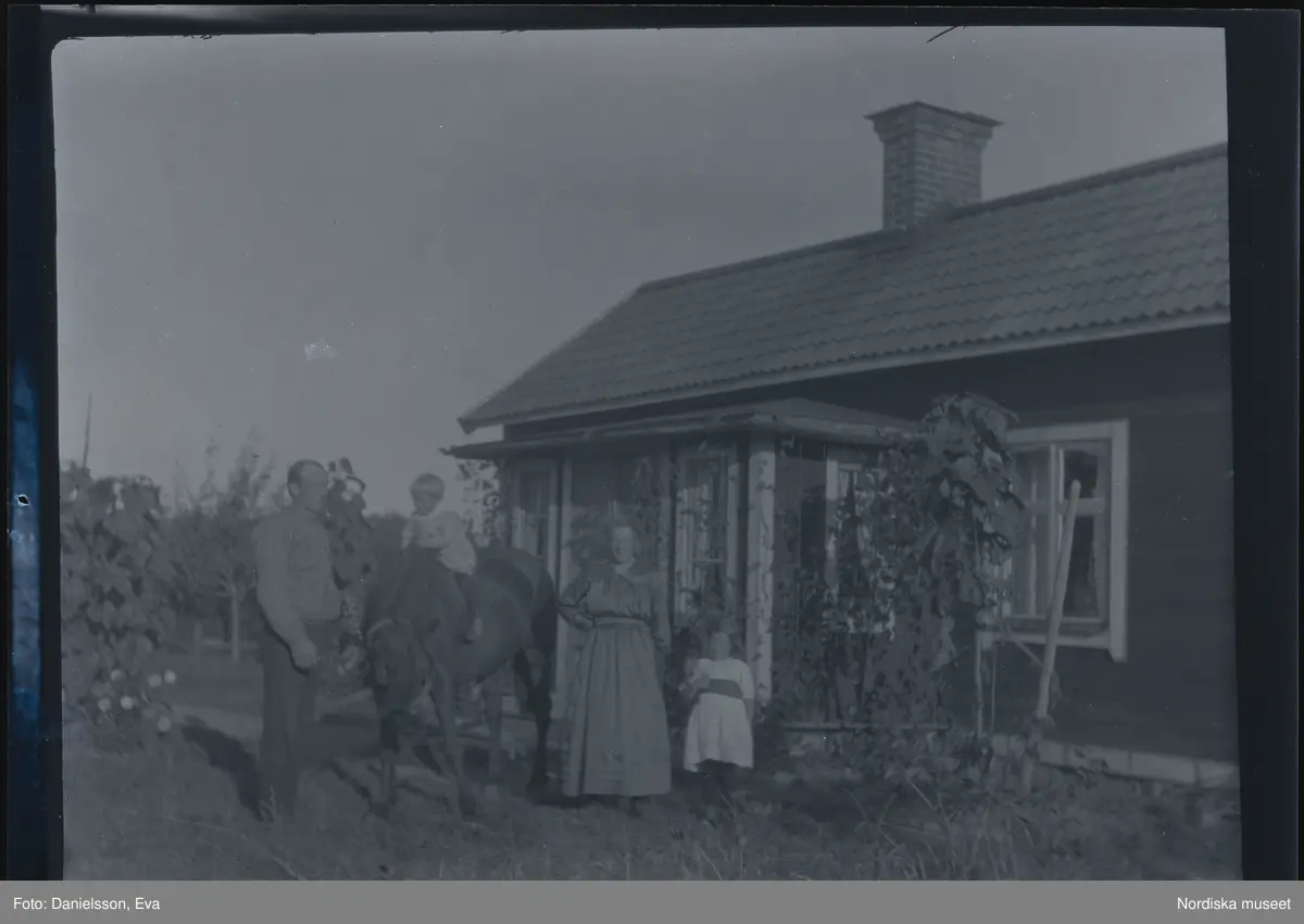 En familj med två små barn fotograferade framför sitt hus, tillsammans med sin häst. Det yngsta barnet sitter uppe på hästryggen.