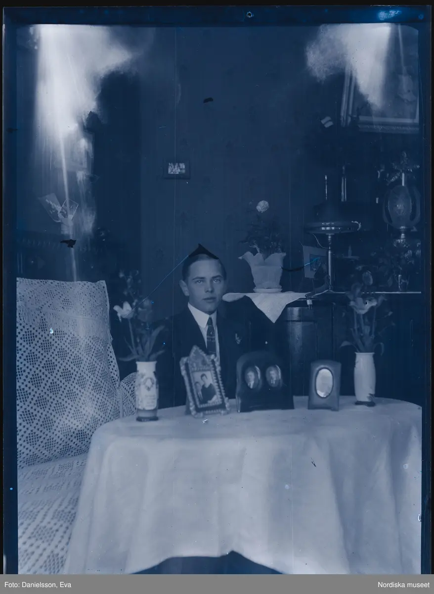 En ung man sitter vid bord i ett rum. På bordet står inramade fotografier och vaser med blommor.