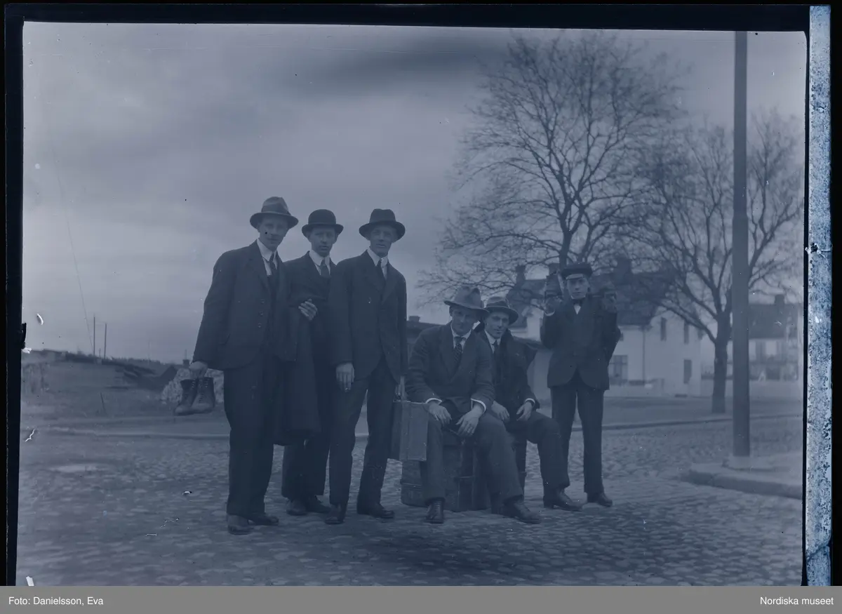 Porträtt av en grupp unga män ute på en gata. De ser ut att vara på väg att resa: ett par av dem sitter på resväskor, en håller en resväska i handen och en annan bär ett par skor.