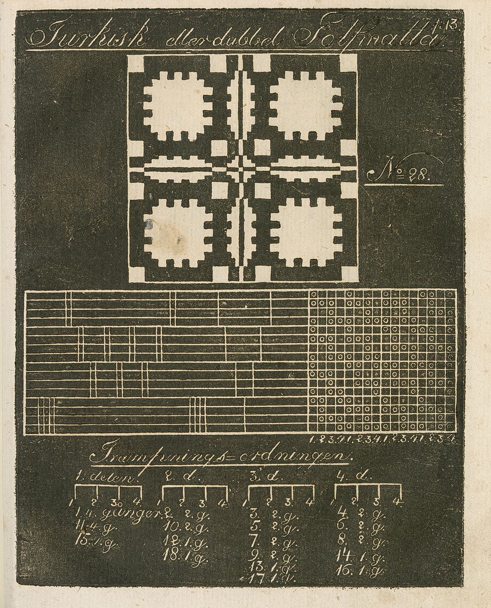 Illustration ur Mönster-Bok för Unga Fruntimmer i Konsten att tillverka vackra Drälls- samt enkla, faconerade och dubbla Väfnader av mångfaldiga slag, utgifven af Maria Christina Ekenmark född Trolle, 1827. Plansch 13 No. 28.
