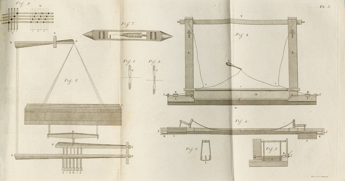 Illustration ur Handbok för Unga Fruntimmer i konsten att tillverka Bomulls- och Linne-väfnader, efter Engelska uppgifter och egna försök, utgifven af J. E. Ekenmark 1820. Plansch 3 i sin helhet och detalj av figur 8 ritning av kontramarsch, figur 3 och 4 av ryckverk. Graverad av S. Andersen.