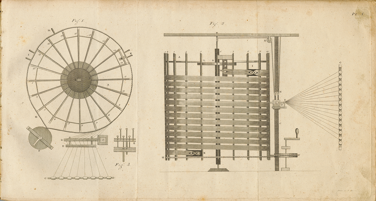 Illustration ur Handbok för unga fruntimmer av J. E. Ekenmark, 1820. Plansch 1 med bilder av varpställning. Detaljbilder på fig. 1 och fig. 2.