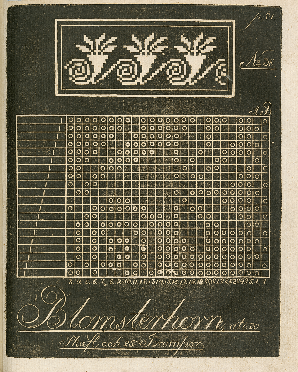 Illustration ur Mönster-Bok för Unga Fruntimmer i Konsten att tillverka vackra Drälls- samt enkla, faconerade och dubbla Väfnader av mångfaldiga slag, utgifven af Maria Christina Ekenmark född Trolle, 1827. Plansch 21 No 38.
