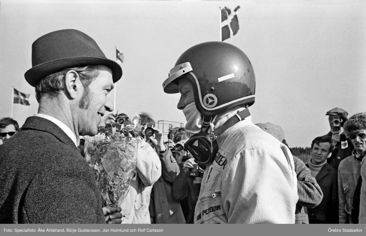 Tävlingsledaren överräcker blommor. Karlskoga motorstadion, 1969-05-03
