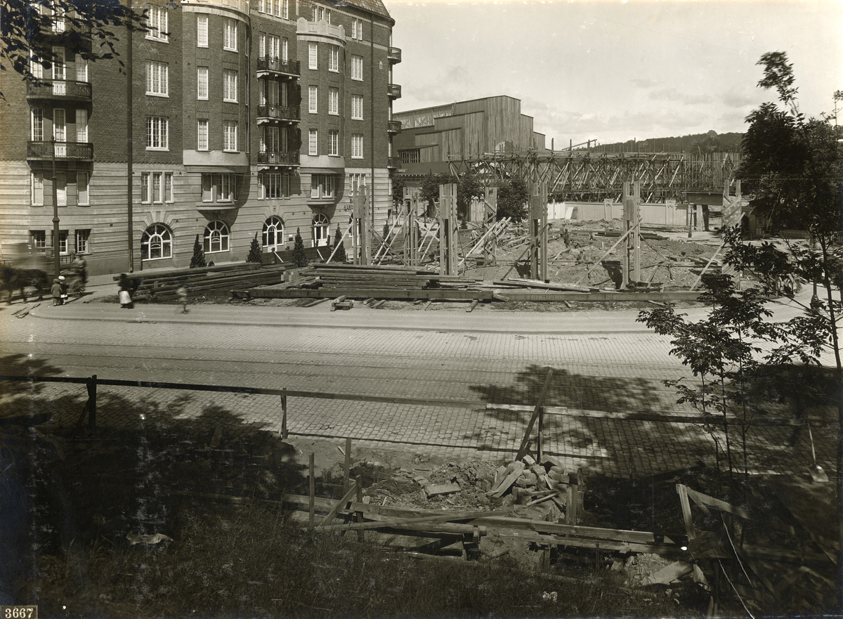 Grundläggningsarbeten för Viadukten, en gångbro som gick över Södra vägen och Korsvägen mellan Minnesfältet och Exportfältet