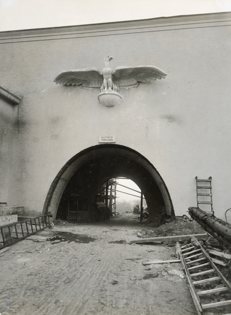 En skulptur av en grip med utbredda vingar över entrén ner till Handelsgatan
