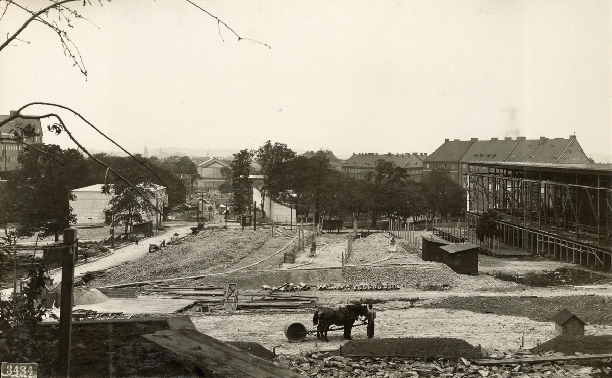 Utsikt från Minneshallen över Stora gården med Huvudrestauranten till höger i bild