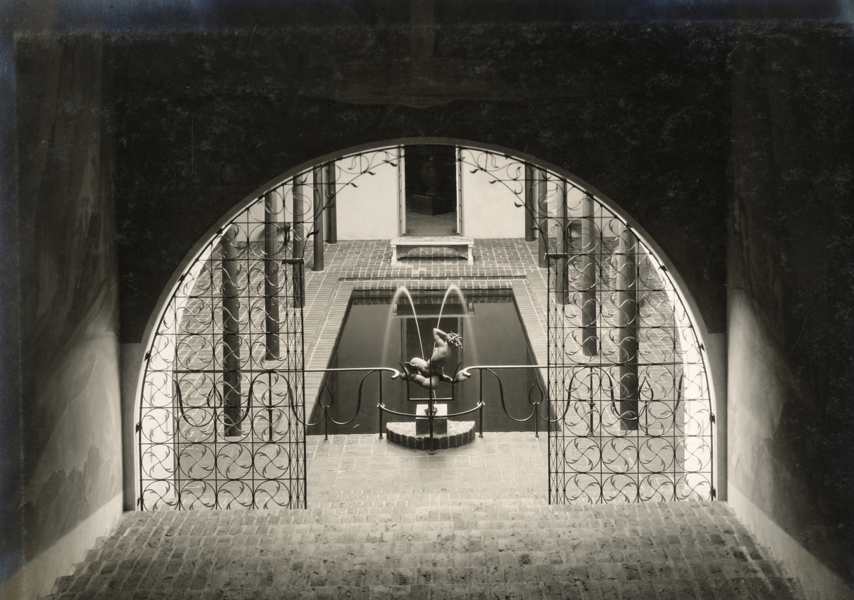 Det öppna atriumet i utställningen för konstindustri med fontänen Solglitter av Carl Milles