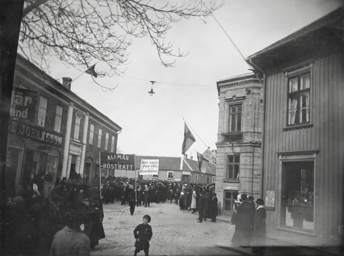 Titel: Demonstration för "Allmän rösträtt" och "Mot kriget för fred och folkförbrödring"