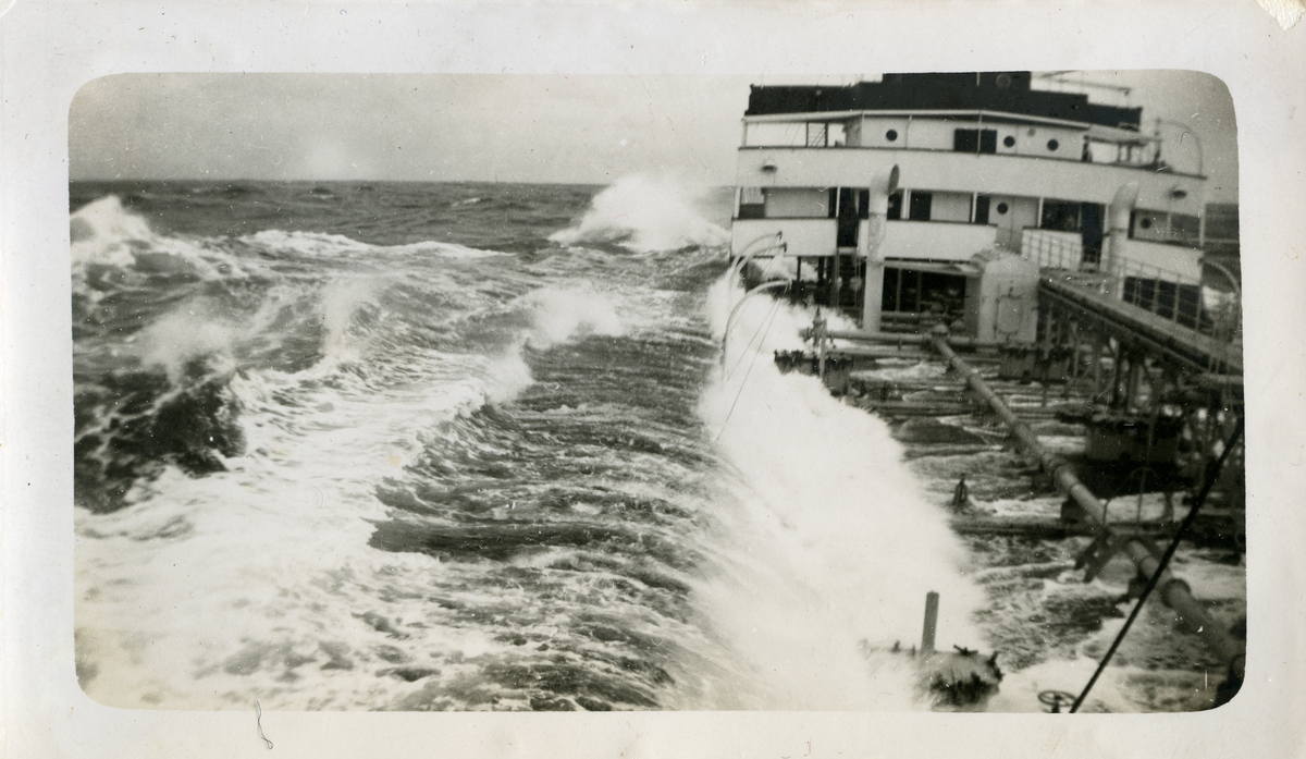 Fotografi föreställande fartyg ute på öppet hav, omgivet av höga vågor. 1900-tal. Från Sjöman Gunnar Henrikssons samling.