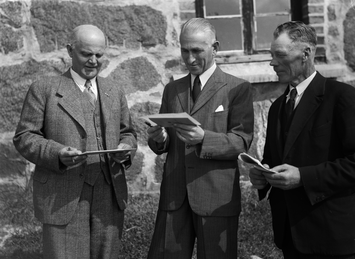 Tre män framför byggnad, Uppsala 1943