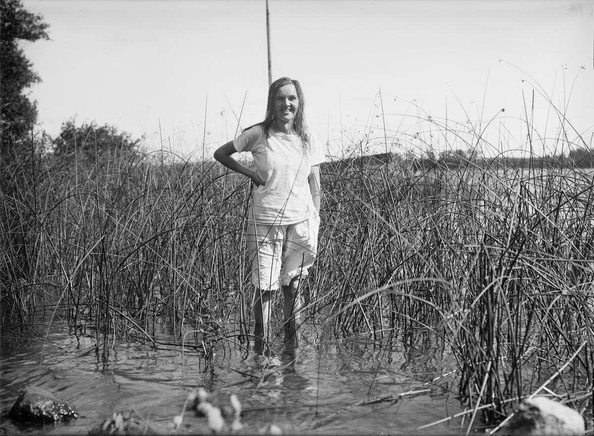 Flicka i undertröja och mamelucker står i vattenbrynet bland vass
