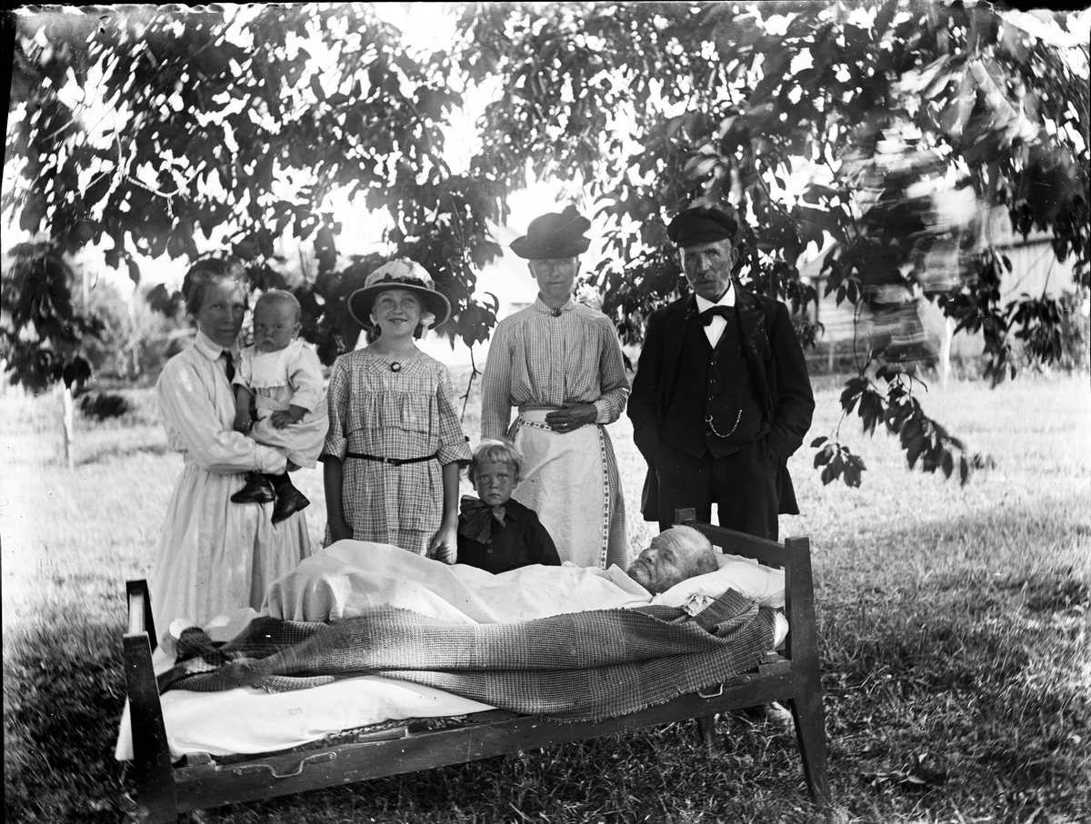 Gruppbild. Man som ligger i en säng utomhus