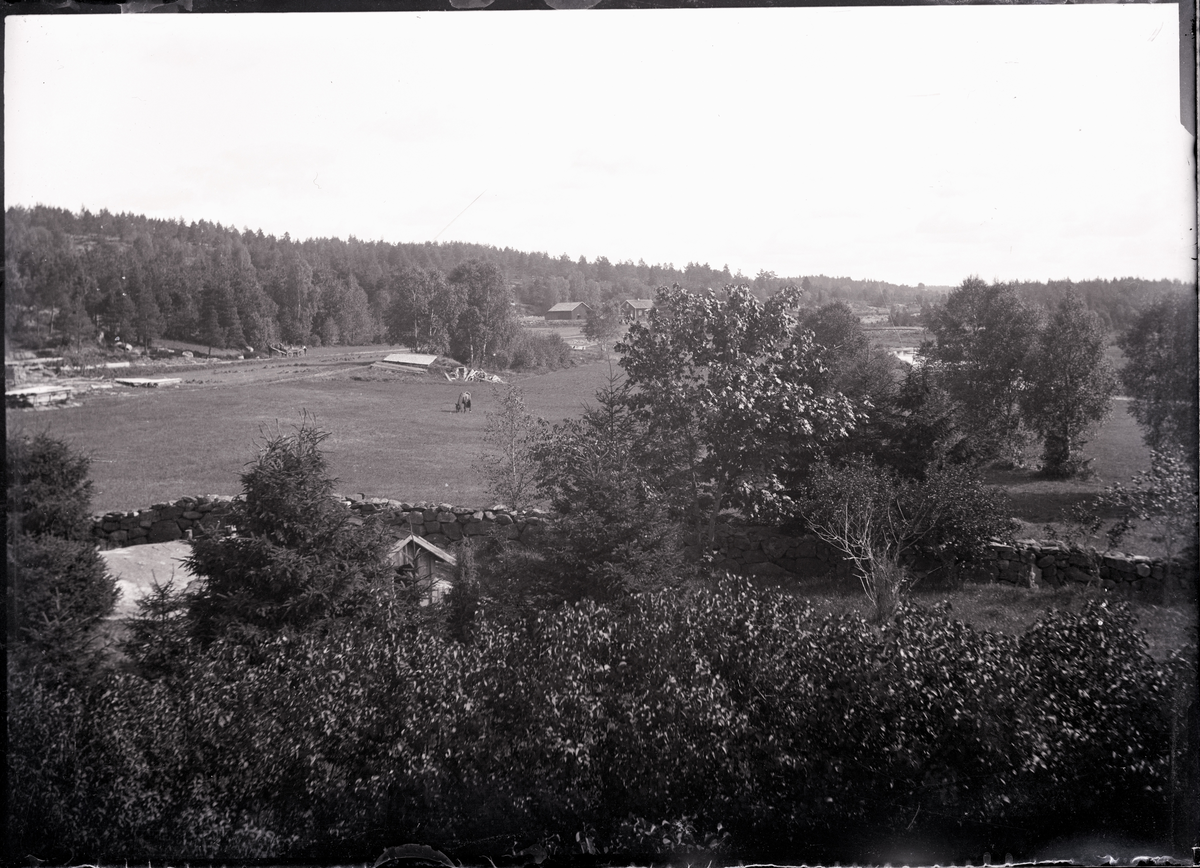 Nårunga. Vy Charlottenberg. Lekstugans tak skymtar till vänster vid muren
