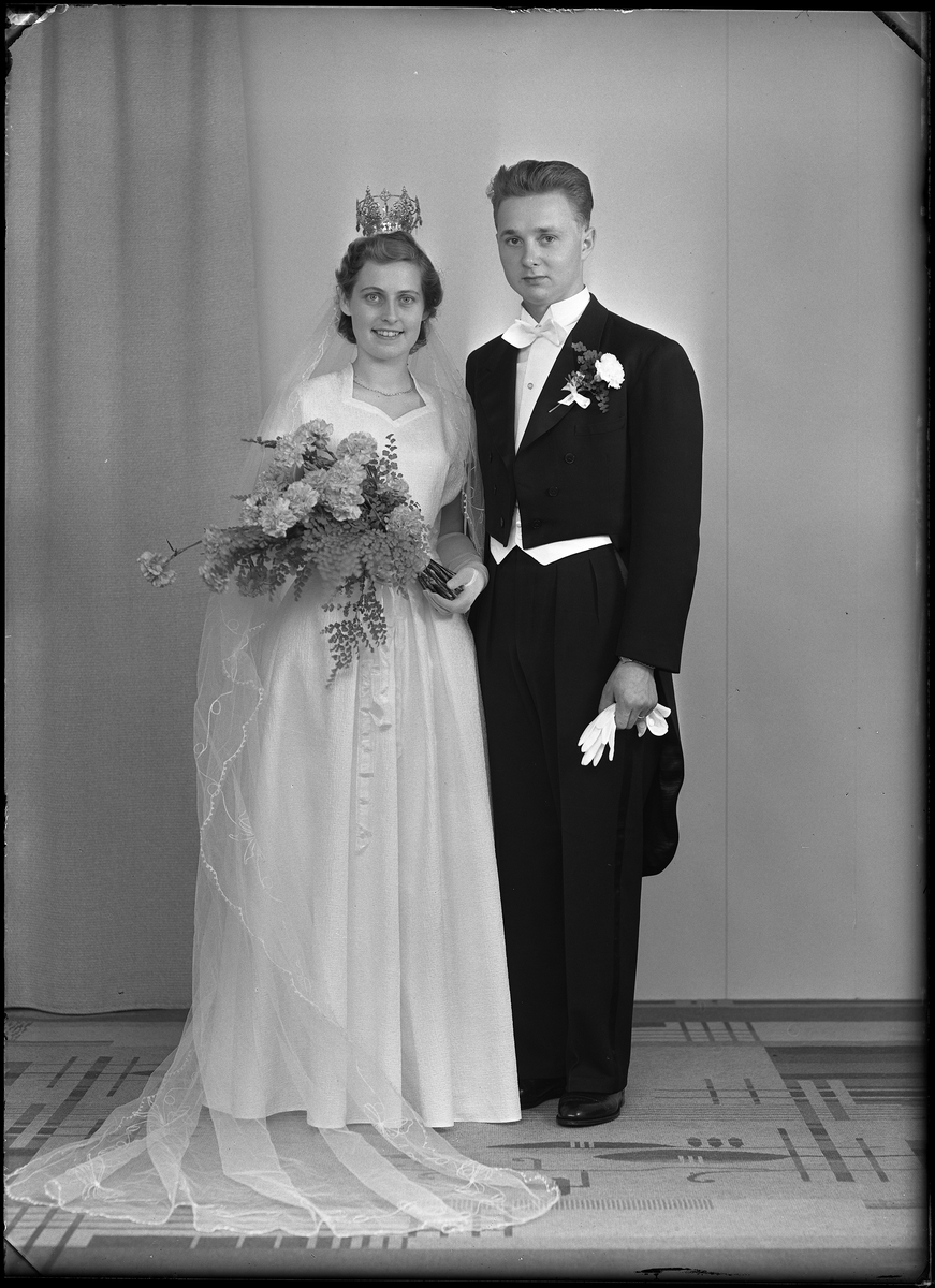 Grupporträtt, brudpar. Göran Klåvus, Mölntorp, Kolbäck.