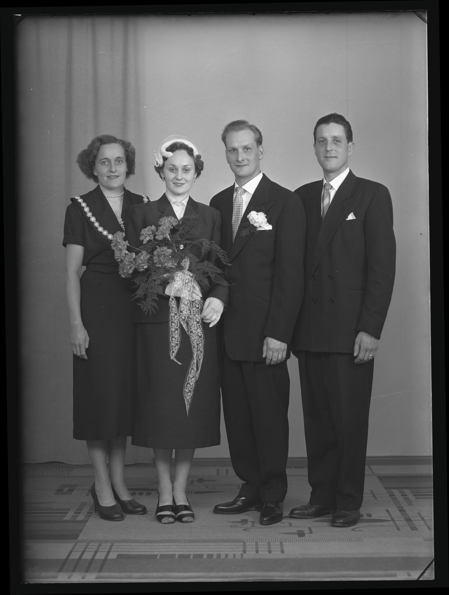 Grupporträtt, brudpar. Stig Brickman, Torsvägen 22 A. Hallstahammar.