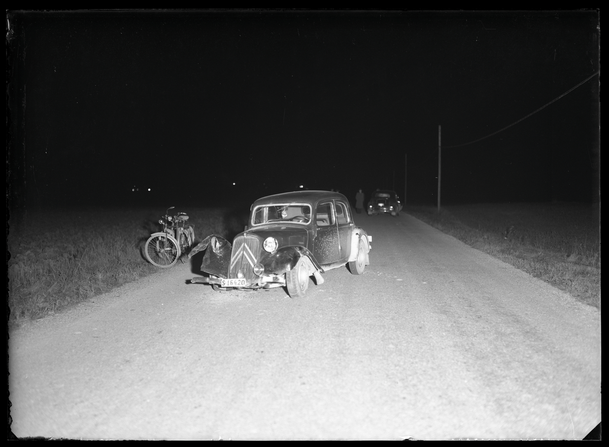 Krock med två bilar och cykel, norr om Sörstafors. 4 november 1951. Landsfiskalen i Kolbäcks distrikt, Hallstahammar.