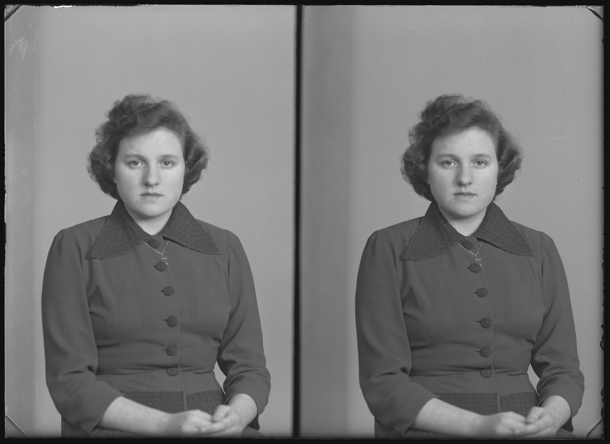 Kvinnoporträtt, pass. Yonne Eriksson. Kapellgatan 7, Hallstahammar. Ur Gustaf Åhmans samling.