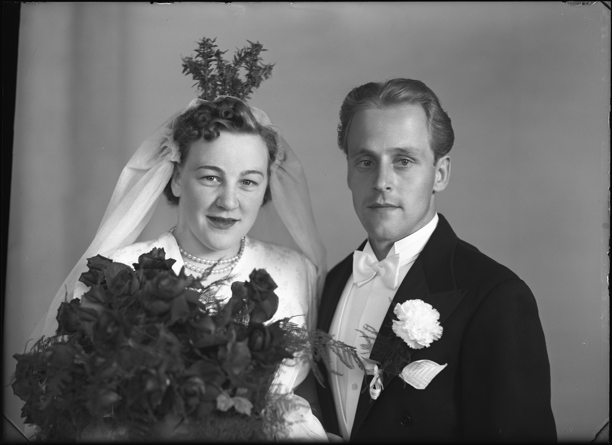 Grupporträtt, brudpar. Nils Hjelm, Vallbygatan, Kolbäck.