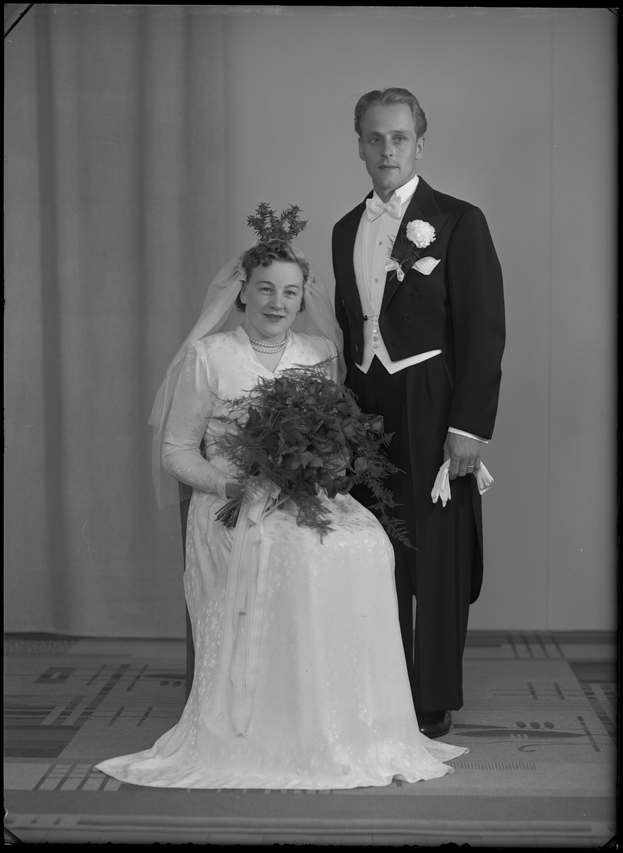 Grupporträtt, brudpar. Nils Hjelm, Vallbygatan, Kolbäck.