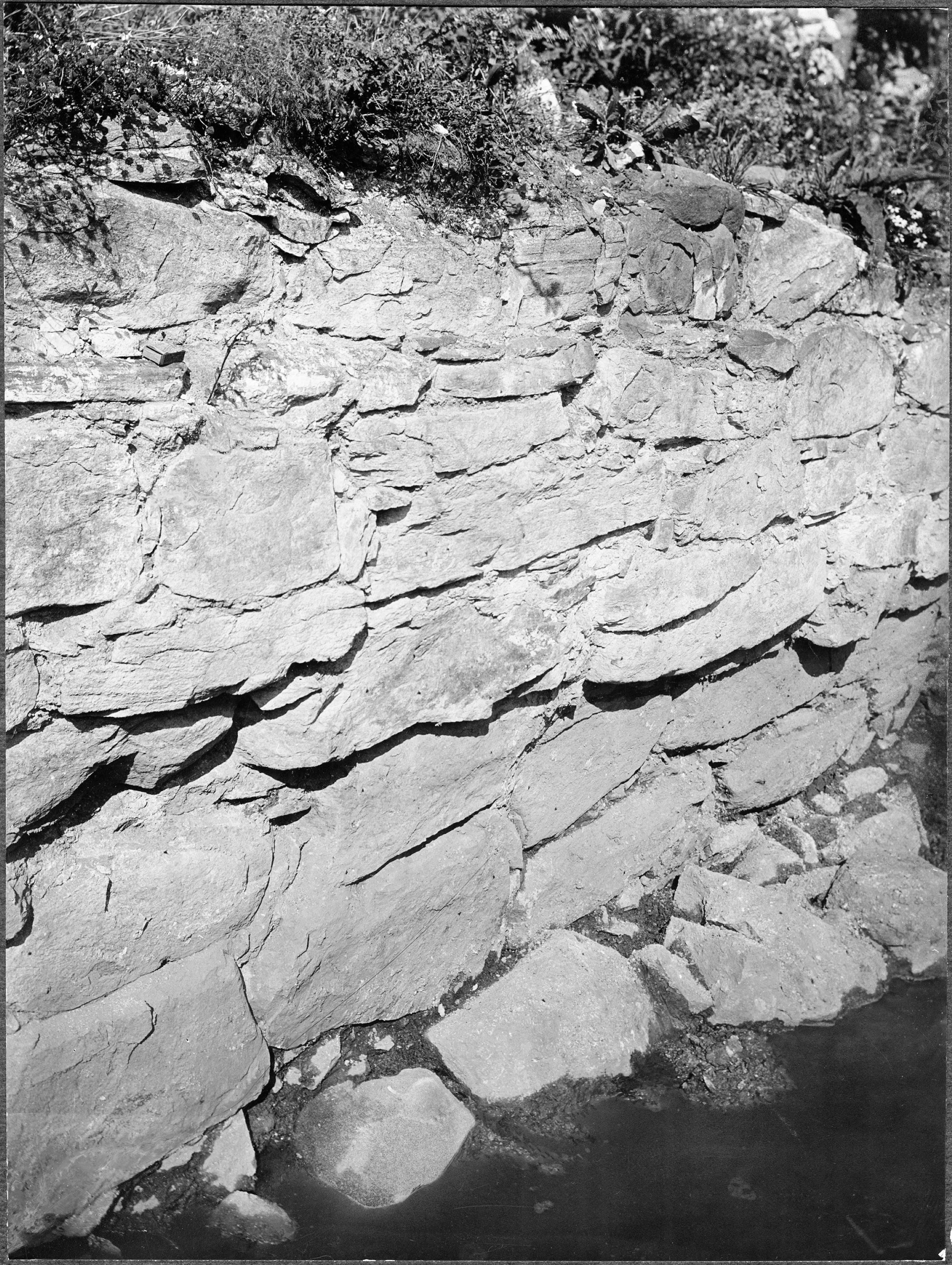Skarven mellan den äldre kyrkans norra mur och den däröver överkragande yngre kyrkans mur.