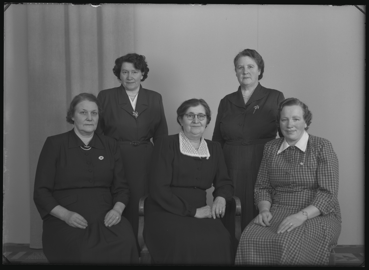 Grupporträtt, fem personer. Koop Kvinnogillet, Styrelsen. Kolbäck. Ur Gustaf Åhmans samling.