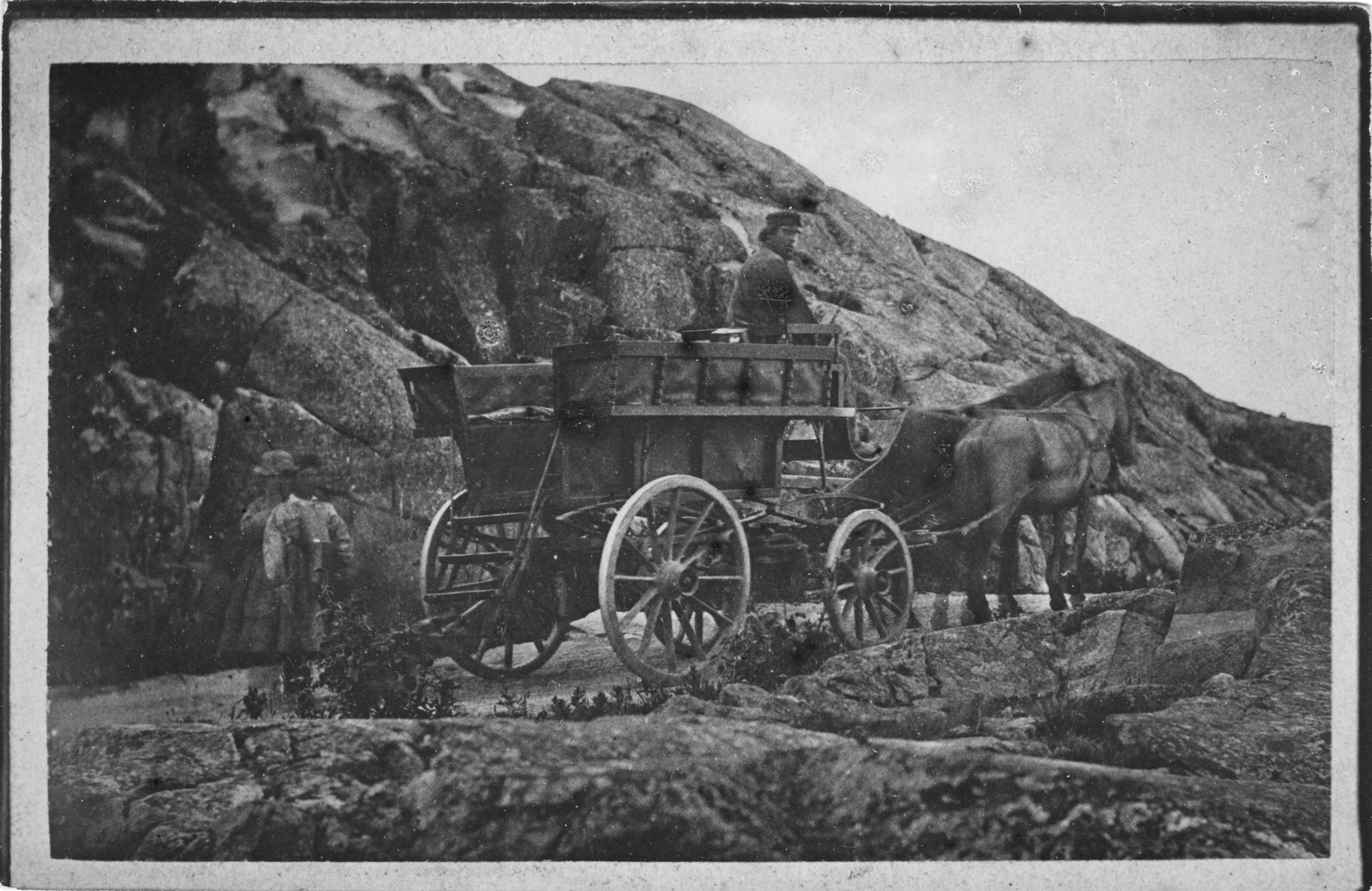 Hästskjuts med kusk. "Skallerormen Omnibus konstruerad af Curman körd af Carl Aelp (?)". ("Skallerormen" Wurst för badgäster".)
