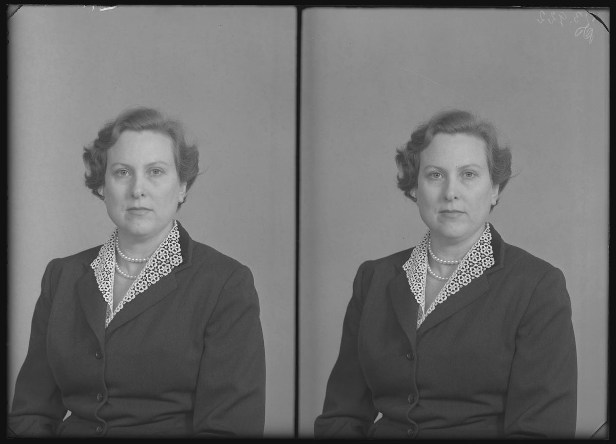 Porträtt-pass. Fru Gunhild Persson. Thulevägen 26, Hallstahammar. Ur Gustaf Åhmans samling.