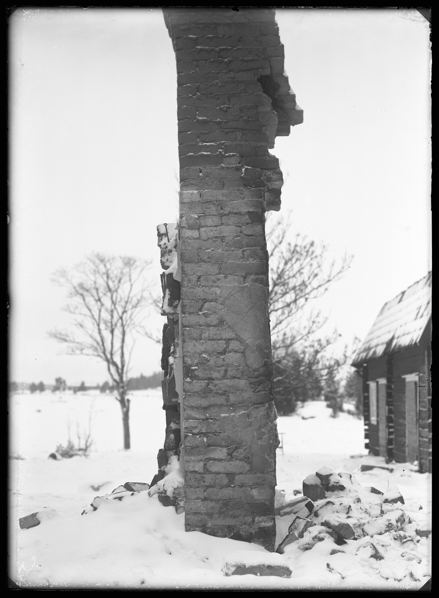 Titel: Branden i Olsta. Murstock. Oskar Öhman, Kolbäck. Ur Gustaf Åhmans samling.