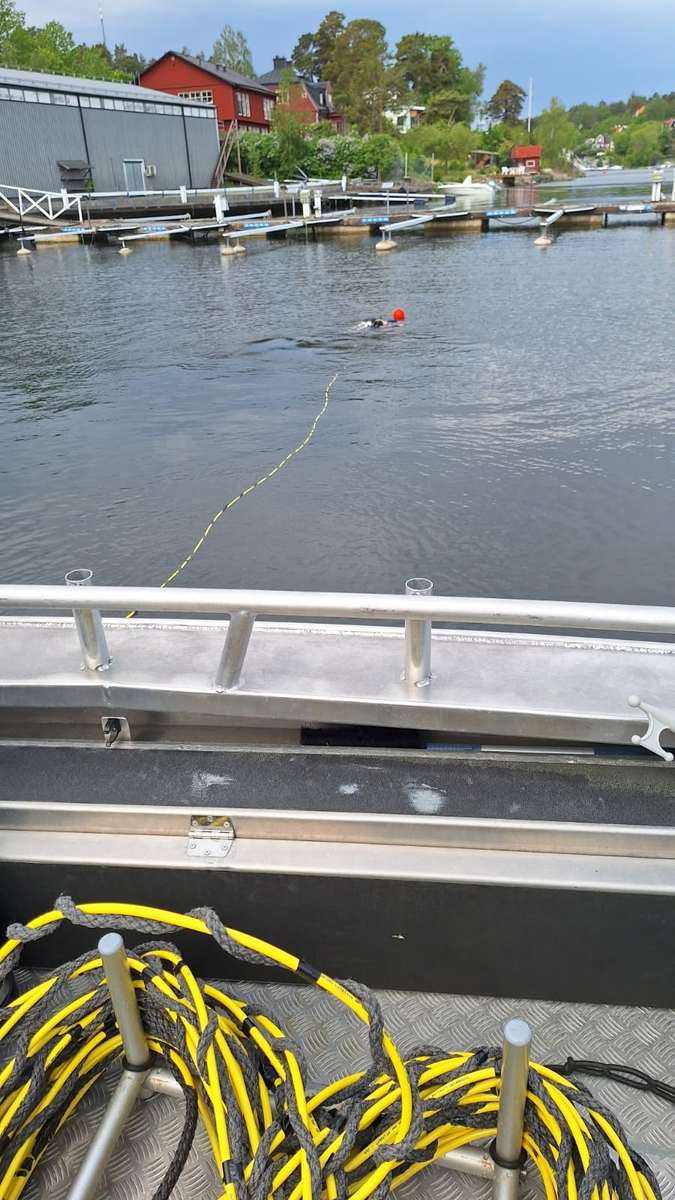 Dykare i vattnet ovanför lamningen som skall dykbesiktigas.
