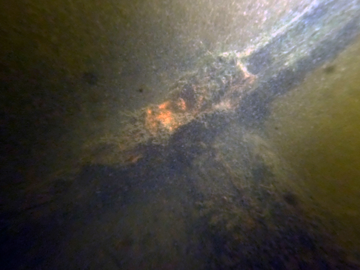 Spant med järnbult och bordläggningsplanka fotat från insidan.