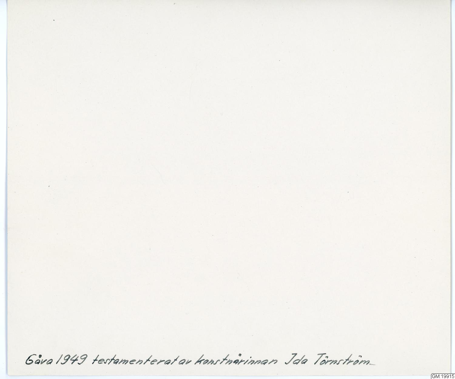 Tavlan föreställer Bäckska trädgården, blick mot norr. Bostadshuset i bakgrunden är Karl Johansgatan 102, Majornas 1 Rote.