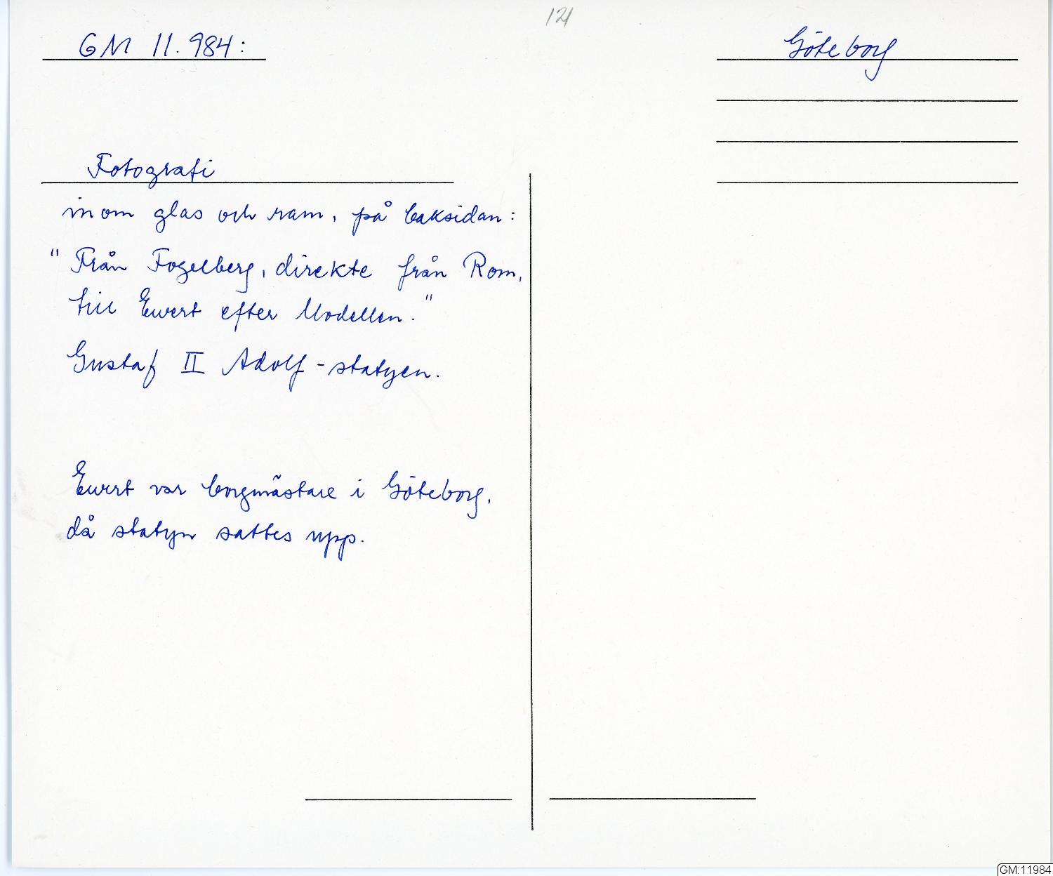 Ett fotografi föreställande Bengt Erland Fogelbergs modell av Gustav II Adolfs staty.