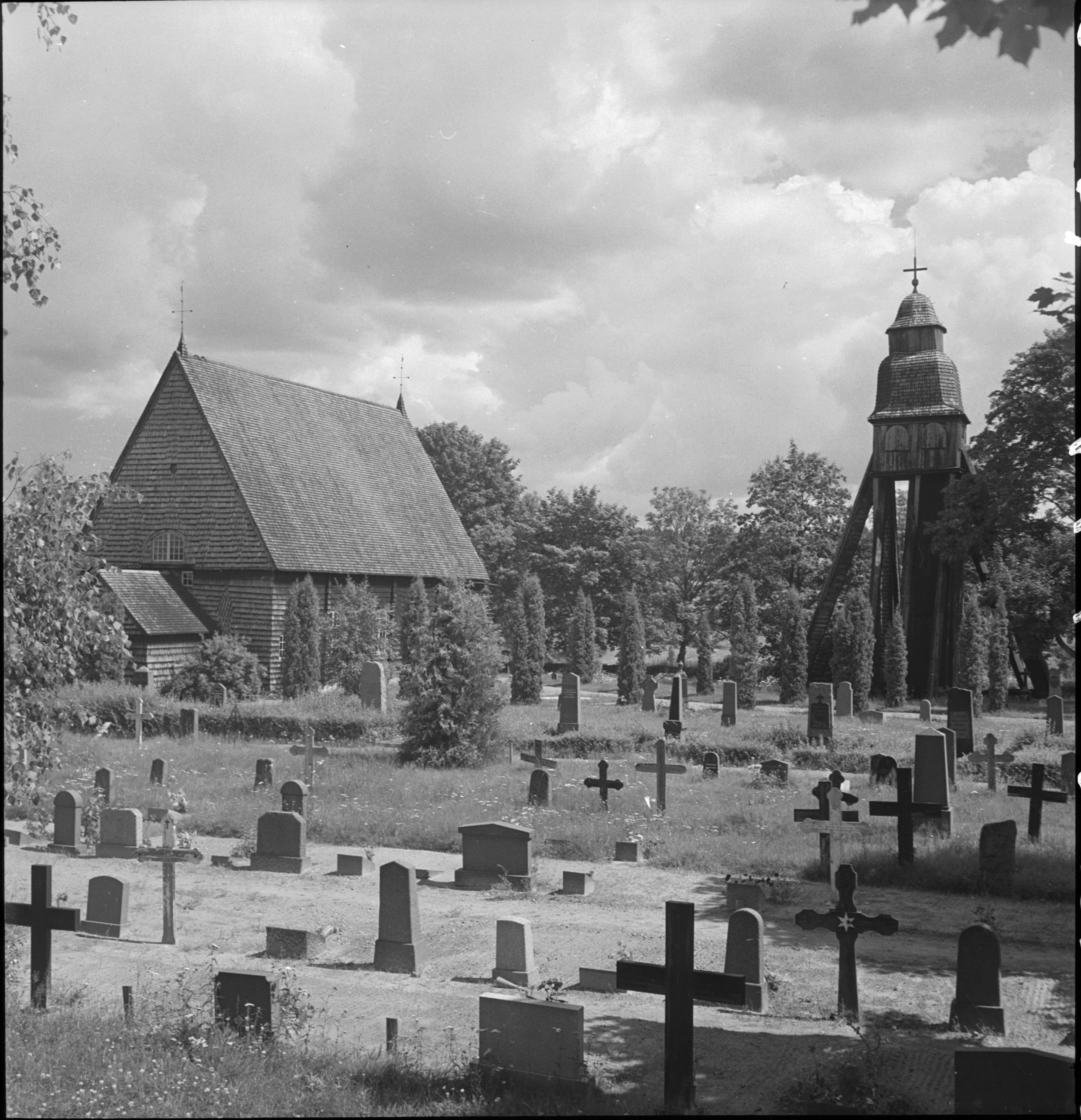 Kyrkan och klockstapeln från sydväst.