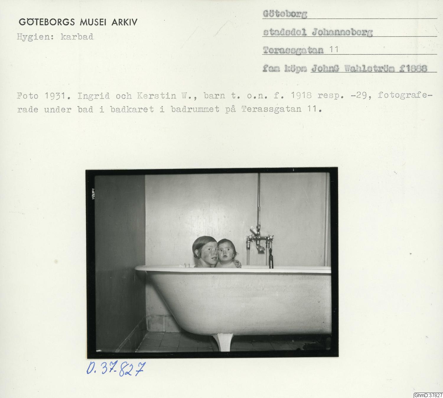 Svartvitt foto, 1931, Ingrid och Kerston W. barn t.o.n.f. 1918 respk. -29, fotoraferade under bad i badkaret i badrummet på Terassgatan 11.