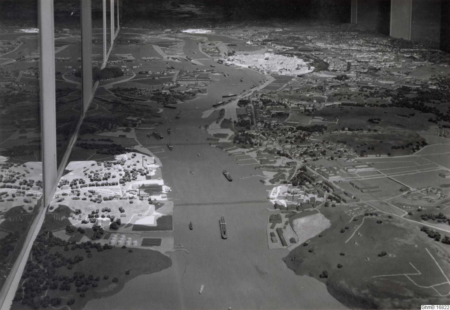 Svartvitt foto, Göteborgsmodellen 1923, Gamla Älvstorp, Carl IX:s Göteborg (närmast) samt det äldsta Göteborg och Nya Lödöse (längst bort), Göteborgstopografiska samlingarna. Göteborgs Museum, Kronhuset.