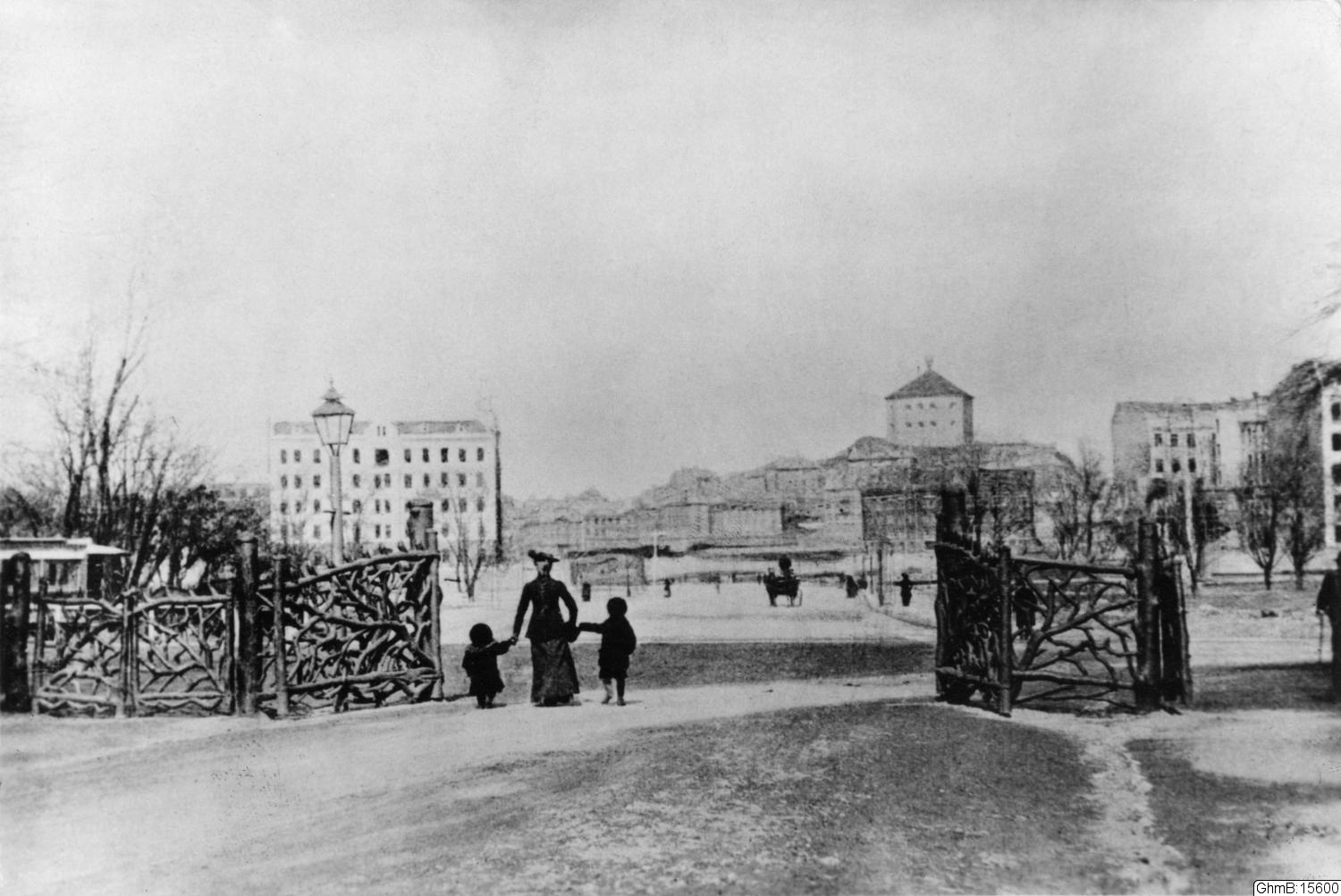 Svartvitt foto, Slottskogen, entrén vid Linnéplatsen - 1900-talets första deciennier.