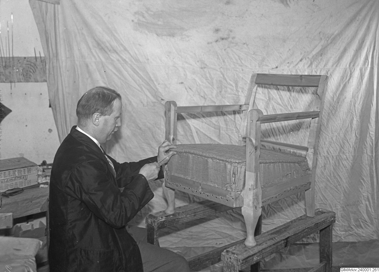 Förvarad i kuvert med texten: "Möbeltapetserare i arbete