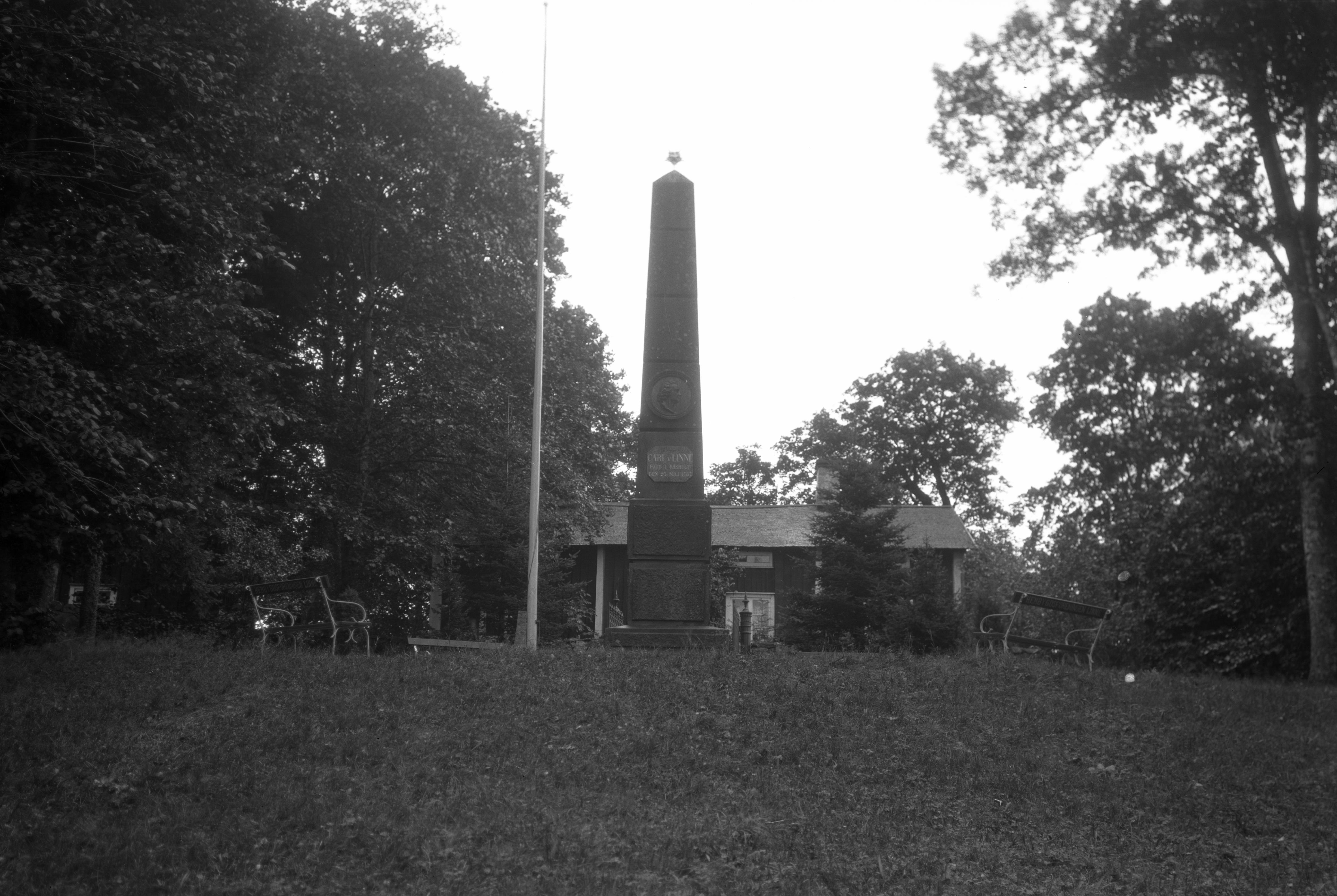 Carl von Linnés födelseort Råshult. Monumentet över Linné i förgrunden, Linnéstugan i bakgrunden.