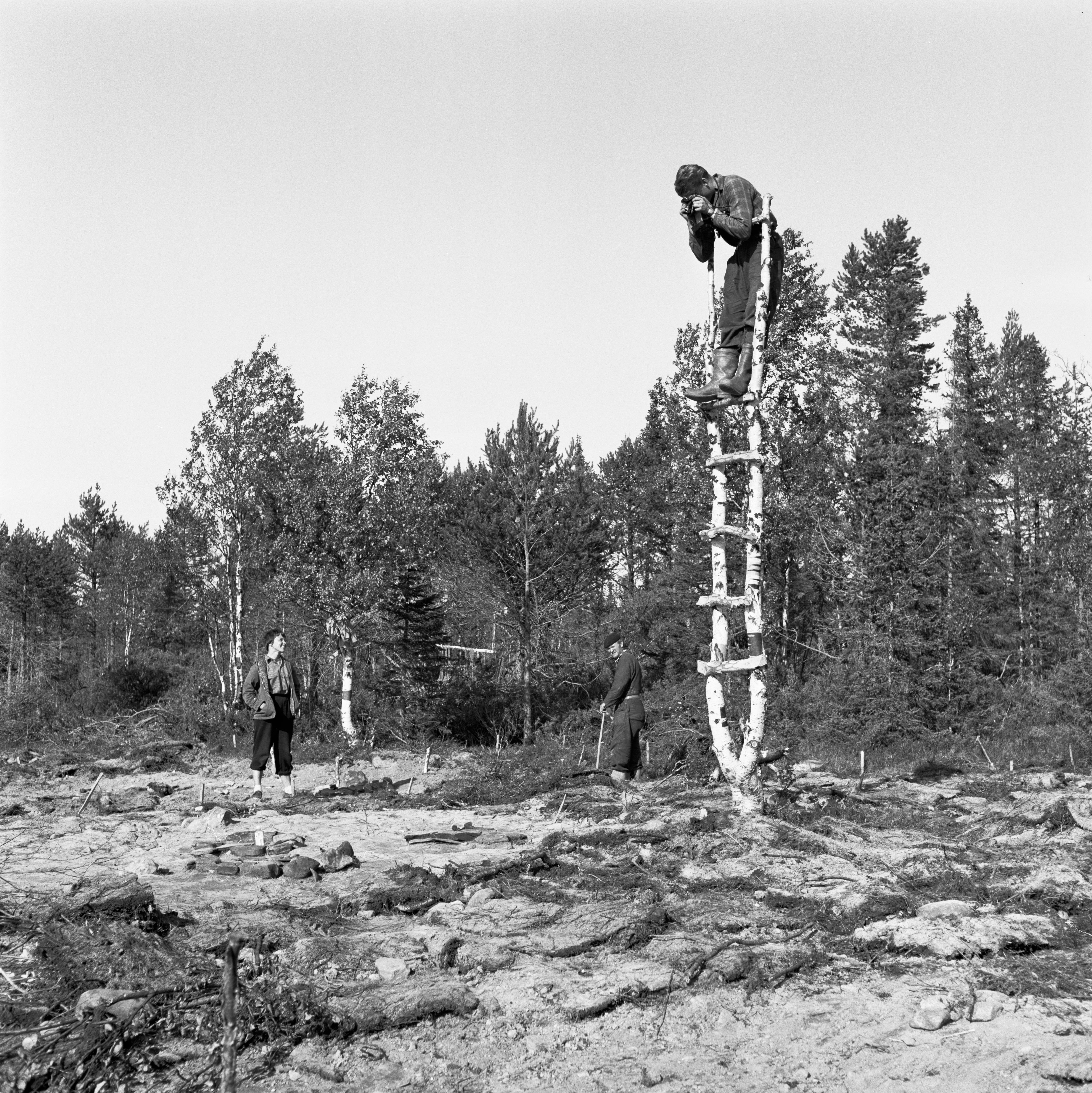 Boplatsutgrävning. Ett uppfinningsrikt platsbygge fick tjäna som fotstege när man skulle fotografera härdarna.