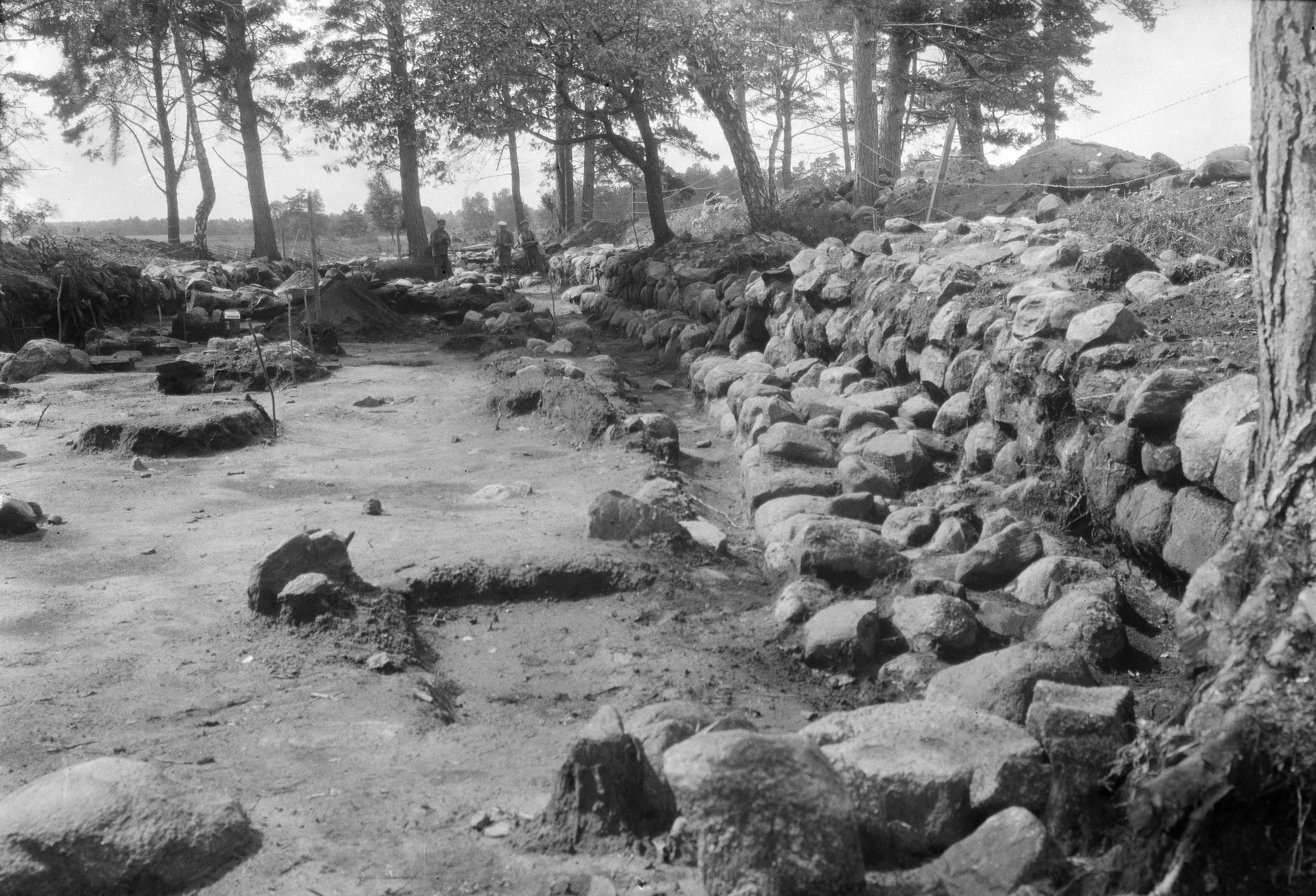 Stavgard. Hus nummer 1. Västra långmuren, nedanför denna den äldre muren.