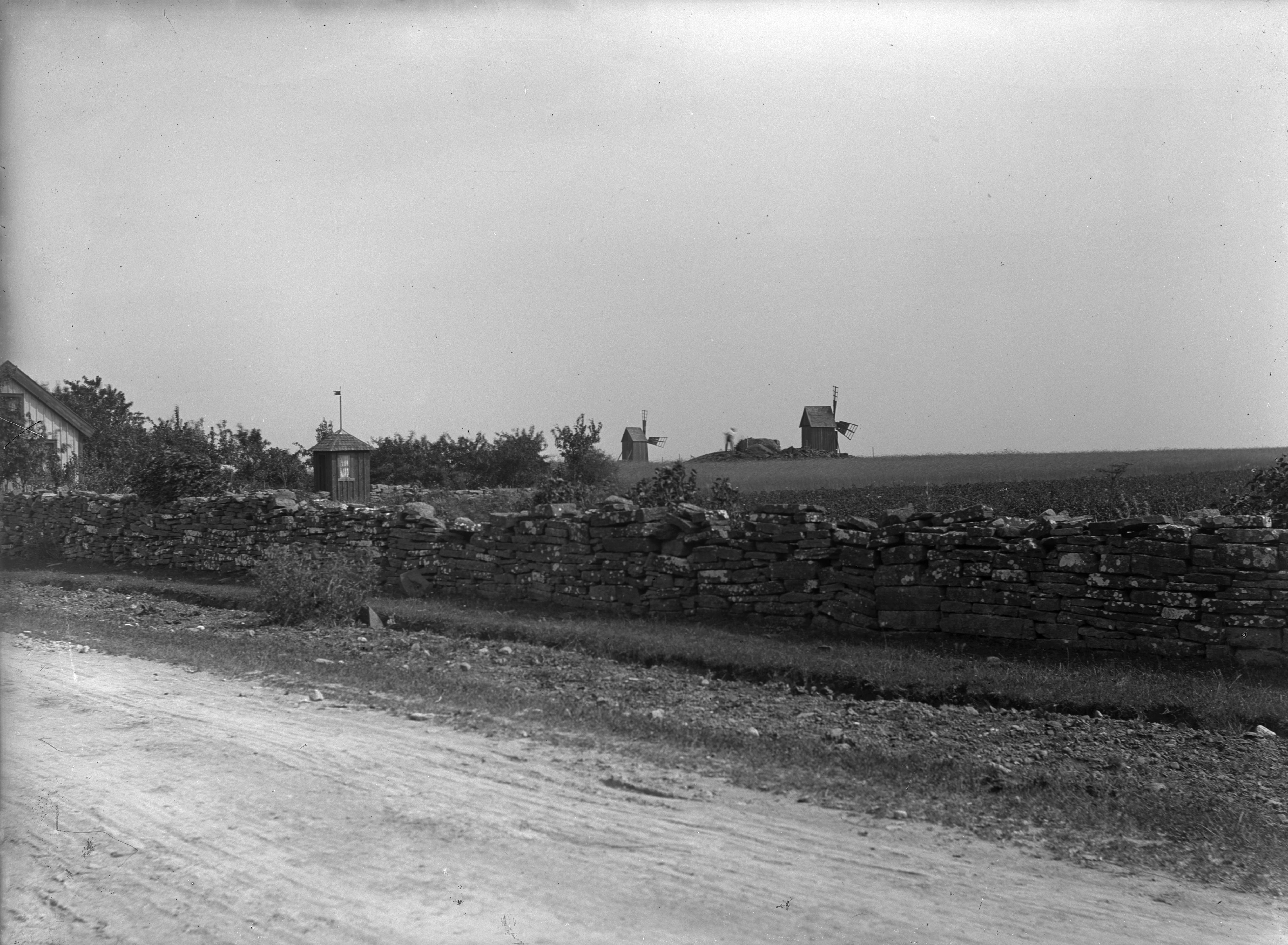 RAÄ-nummer Resmo 68:1. Gånggrift under utgrävning i bildens mitt och väderkvarnar i bakgrunden.