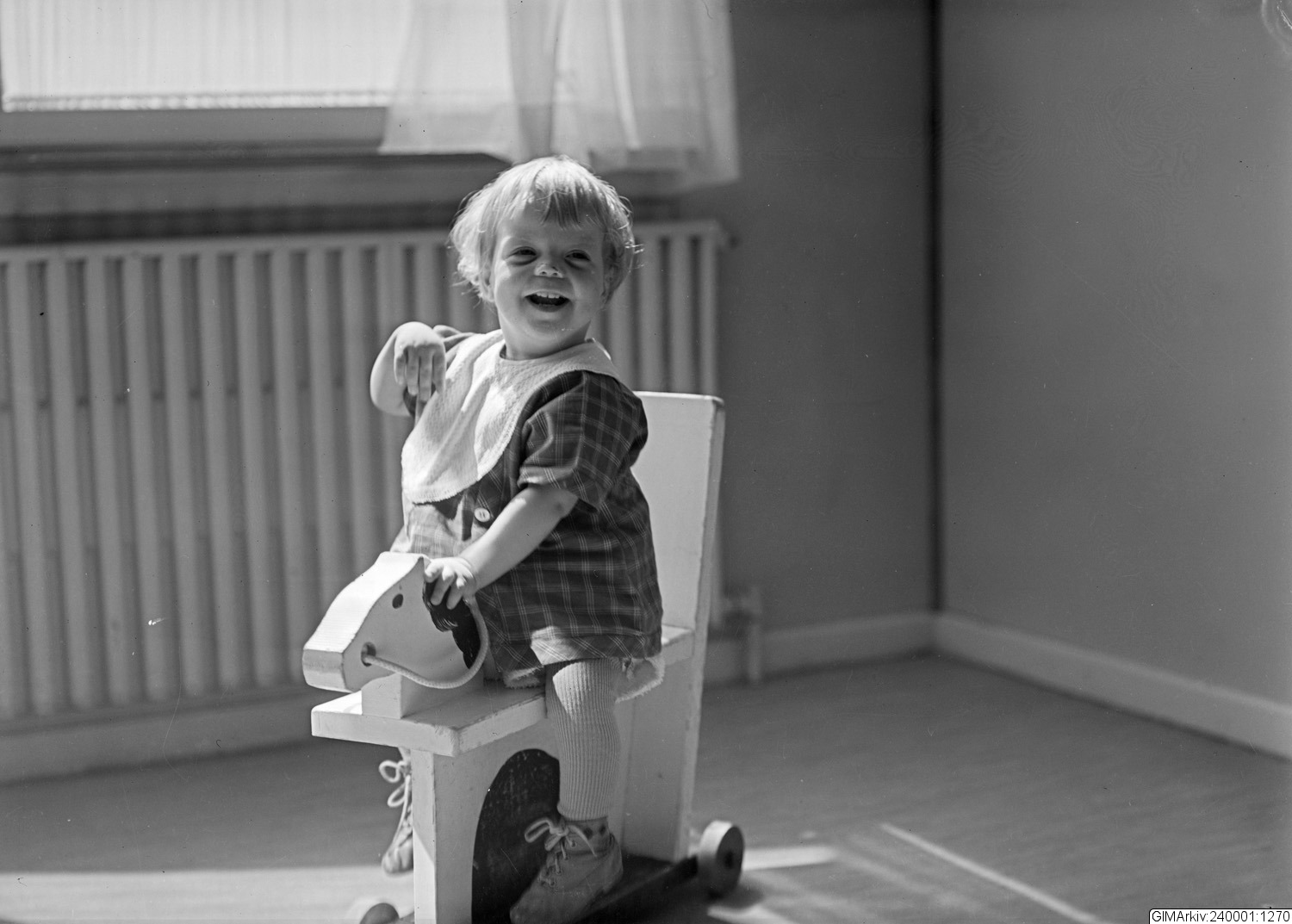 Förvarad i kuvert med texten: "Solgårdar. Flicka på gunghäst