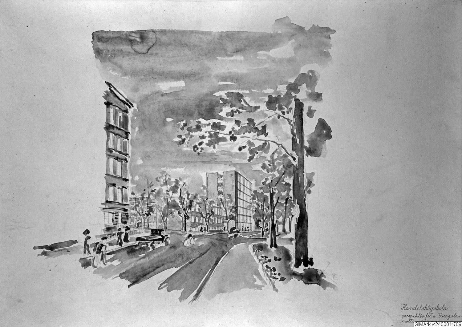 Beskrivning: Förvarad i kuvert med texten: "Ritningar, teckningar Handelshögskolan i Gbg.