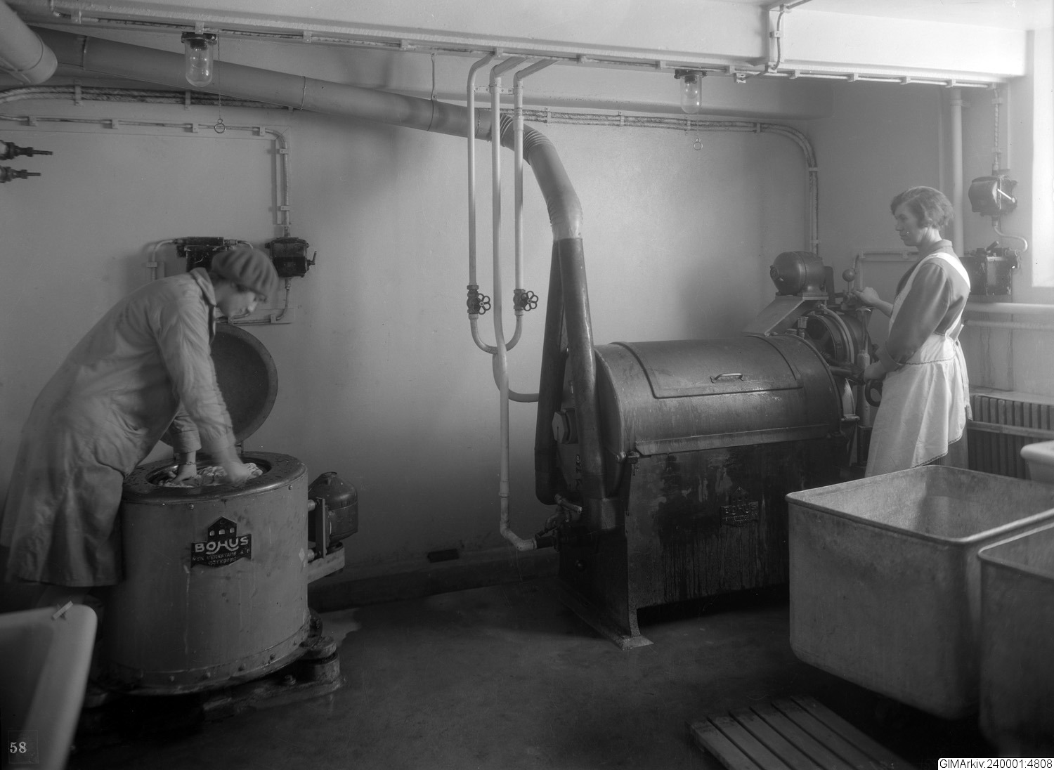 Förvarad i kuvert med texten: "HSB, tvättstuga med två kvinnor"