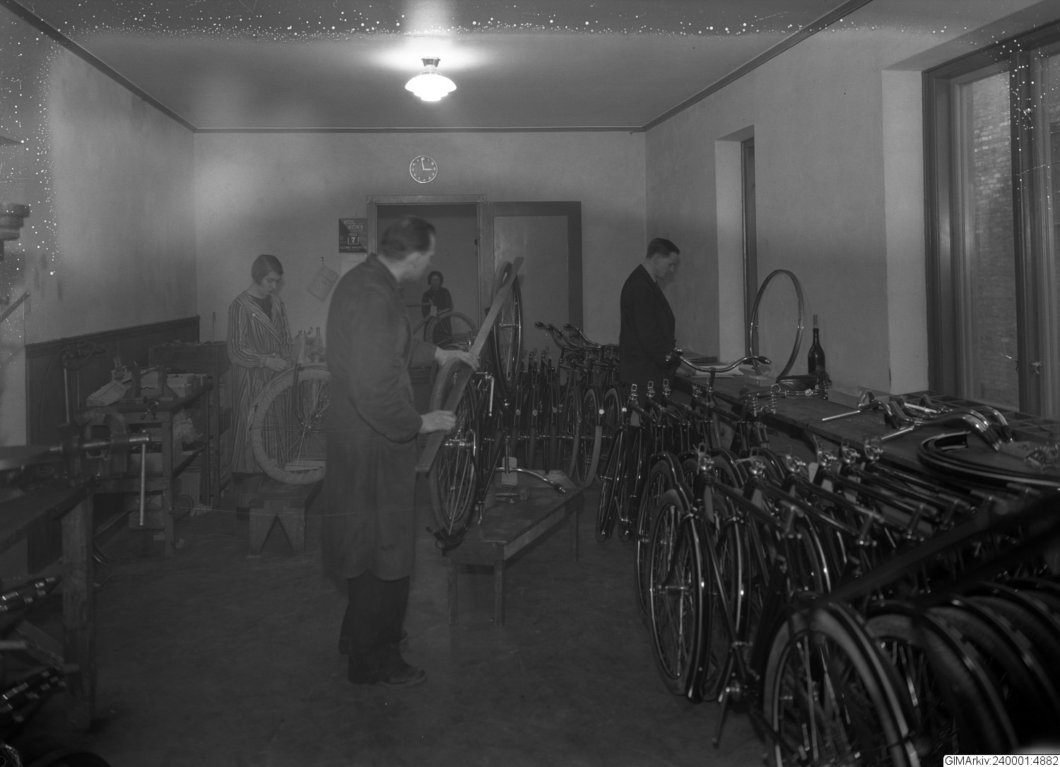 Förvarad i kuvert med texten: "Cykelfabrik, interiör, Värnamo Gummi- och Cykelfabrik"