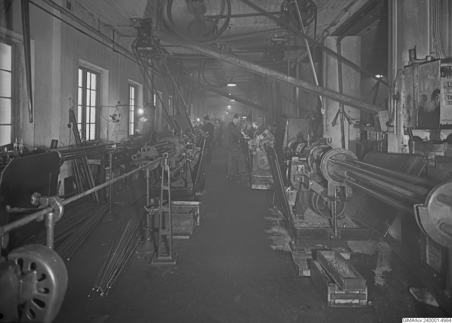 Beskrivning: Förvarad i kuvert med texten: "Monark Cykelfabrik. Interiör. Produktionen"