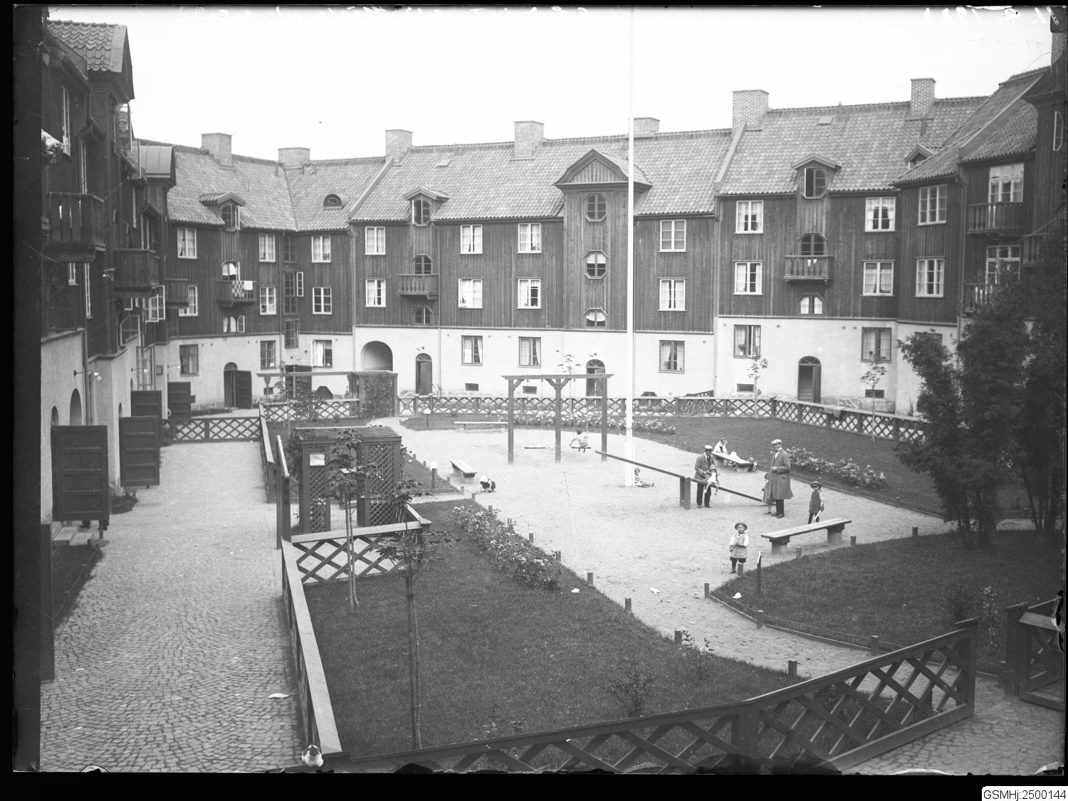 Härlandavägen år 1922. Kvarteren Aleklätt och Vättlefjäll vid Uddevallplatsen i Bagaregården är byggda i nationalromantisk stil. De stora, öppna innergårdarna var en nyhet som sammanföll med nationalromantiken. Gårdarna är omsorgsfullt formgiven med mycket grönska och plats för lek. Här kvarteret Kinnekulle vid Härlandavägen.